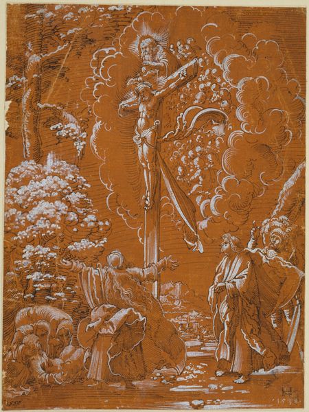 Curator: Here we have "The Annunciation to Joachim of the Birth of Mary," an intriguing Northern Renaissance drawing dating between 1515 and 1600 by an anonymous artist. Editor: It's quite striking, really. The reddish-brown wash gives the scene a very earthy, almost tactile quality. I find the lines somewhat frantic. What's your initial read? Curator: I'm drawn to the spatial arrangement. The angel's figure seems to descend along a very definite vertical axis, contrasted by Joachim’s upward, pleading gestures, creating a dynamic interplay of celestial and terrestrial realms. Notice how the pen strokes carefully delineate drapery and wing feathers to express divine will through structured form. Editor: Yes, the lines, and those hatching techniques speak volumes about the laborious process. Look at the texture achieved with ink on paper—the contrast of smooth surfaces with the ruggedness of the landscape reminds me how much physical effort went into this piece, and its artisanal appeal. Consider where the artist sourced his pigments; it surely would have been a laborious process to find a deep red that suited his purposes. Curator: Absolutely. And observe how the figures are positioned. Joachim's placement at the lower portion creates an anchor while simultaneously drawing our eye to the unfolding narrative, carefully designed with a keen sensitivity to balance. Editor: The narrative focus leads me to ponder the social dynamics—religious themes weren't simply artistic statements but profound societal affirmations of power and morality. An artisanal workshop would require complex social and economic structures, reliant on hierarchy and specialized labor to deliver works like this. Curator: The artist's treatment of light and shadow, achieved with layers of hatching, gives a profound emotional depth, invoking humility, hope and divine command—perfect for devotional viewing. It's not simply representational. The artist skillfully leads the viewer through allegorical realms. Editor: Agreed, but also worth noting is that the act of making art becomes, in its way, as important as the object itself, with skilled labor merging artistry and devotion to resonate deeply across social fabrics. The intersection between the artist, the commission, and the community cannot be understated here. Curator: An insightful observation, underscoring the intersection of form and context to enrich our understanding. Editor: Precisely, considering art’s raw material origin and laborious creation reframes our viewpoint, and hopefully appreciation too.