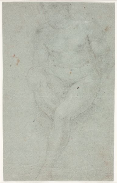 Curator: Here we see a study by Hendrik Krock. Created sometime between 1671 and 1738, this drawing titled "Tilbagelænet mandlig modelstudie" depicts a reclining male nude and belongs to the collection of the SMK, the National Gallery of Denmark. Editor: Huh. It reminds me of one of those anatomical studies you see in old medical texts. Somber, almost…spectral. Like an unfinished thought. Curator: It is academic art. We can understand it as a work deeply connected to the Baroque portrait style, focused on idealizing the human form and conveying movement and emotion. The reclining pose may be reminiscent of classical sculptures and evokes contemplation or perhaps vulnerability. Editor: Vulnerability, yes. The guy's got a relaxed vibe but, with the pale hue, the sketchy outline...he's presented kind of raw, stripped bare in more ways than one. Curator: These academic studies often focused on specific elements—form, light, shadow—to prepare artists for larger, more complex compositions. The symbol here may be of knowledge seeking and a display of technique—skill at capturing musculature and form. Editor: Perhaps. Or maybe it’s the fleeting nature of beauty. Everything decays; that’s what the great still lifes told us! You know, for an anatomical study, there’s almost something dreamlike about it, maybe because of that diffused, faded palette. Curator: Dreamlike qualities weren’t necessarily the artist’s main goal but I appreciate how this aesthetic contributes to an enduring mystery. Editor: Definitely intriguing! It's one of those pieces where the imperfection—the rawness, if you will—becomes the real statement. It stays with you somehow, you know? Curator: Precisely. It shows how technical exercise transforms, perhaps accidentally, into something emotionally compelling. Thank you.