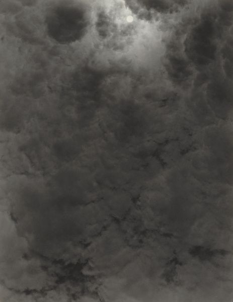 Curator: Wow, this photograph pulls me right in! It feels so expansive, almost cosmic. Editor: We're looking at Alfred Stieglitz's "Equivalent, Set C2 No. 2" from 1929, a black and white photograph. He really pushed photography into the realm of modernism. Curator: Modernism? I see these gorgeous swirling clouds. There’s such raw emotion – like nature reflecting my inner self back at me. Editor: That's exactly what Stieglitz intended! He called these his "equivalents," these photographs weren't meant to represent actual clouds. They were about capturing the feeling, the essence, of an emotion, or a state of being. The goal wasn't a literal transcription but, instead, emotional correspondence, particularly pertinent at a time of rising anxieties on race and class divisions during the Harlem Renaissance. Curator: So, these clouds aren’t really clouds? He’s using them like metaphors…for what? The complexities of being alive? Editor: Precisely. He strips away context and location to encourage introspection. Consider how landscape, historically a celebrated art form dominated by white artists, intersects with the politics of visibility and representation in early 20th-century America. Whose experiences get centered in these universal emotional landscapes? Who is afforded this privilege? Curator: That makes me rethink the small disc in the centre – is that the moon? It felt serene earlier, but now there's an intensity – it could just as easily be an eye, scrutinizing or judging! Editor: The image can feel both comforting and unnerving, can't it? And the use of monochrome only intensifies that sense. The absence of color encourages us to consider the stark contrasts inherent in lived experiences, the dualities of light and shadow, presence and absence, which often mirror power dynamics within society. Curator: It's a brave way to use a camera. You know, to point it upwards, to inner space! And perhaps not even space… but feeling. It really unlocks something… Editor: Stieglitz was aiming for transcendence, albeit tinged with the realities of the era. His photographs challenge us to confront uncomfortable truths about ourselves and the society we inhabit. Curator: Well, now, thanks to your insight, this evocative work isn't only aesthetically captivating. I understand now it is meant to urge its viewer to connect with that experience with the world and its complicated times in their core, even, by thinking about feelings, even at their extremes. Editor: Indeed! Thinking critically can deepen the encounter of art and self.