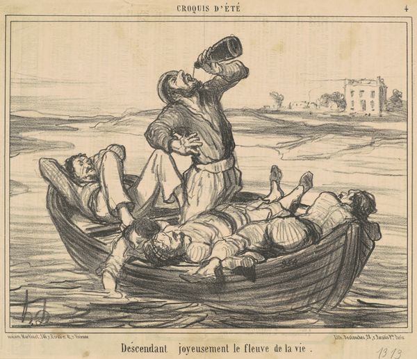 Curator: This lithograph by Honoré Daumier, dating from around the 19th century, depicts Archimedes demonstrating to English engineers his device for raising a whole fleet at Syracuse. What strikes you immediately about this work? Editor: The sheer audacity of the image! And the crude materiality. Look at the thick, dark lines, almost aggressively etched, conveying a sense of raw power, as well as social criticism. There's very little subtlety, and it suggests the drawing was produced in haste and with basic means. It highlights the material circumstances under which such critical art could circulate. Curator: Precisely. Daumier often used lithography to publish socio-political commentary quickly through popular newspapers. It was a medium perfectly suited to disseminate caricatures targeting specific political issues to a large audience. What appears to be 'crude' is actually quite sophisticated. Editor: Perhaps, but the lithographic crayon has such a physical presence here. Look how the tonal variations are achieved with seemingly brute force – building up layer after layer, resulting in such dark shadow. It reveals something of the labor, the making-of. And I suppose this boldness is what would capture a viewer’s attention amidst the chaotic newsprint. It draws attention to the image, rather than letting it dissolve back into its context. Curator: Agreed, and considering the broader scope, you start seeing Daumier utilizing Archimedes as a satirical stand-in. He subtly mocks the political and technological hubris of his era. By setting this grand feat in a classical setting, it's as if he’s suggesting the modern age’s ambition is just as prone to folly as ancient Greece. Editor: It certainly highlights the enduring allure of innovation, whilst exposing its potential to quickly descend into folly or be used for oppressive, anti-social ends. The way that rudimentary device is leveraged to lift an entire fleet – that juxtaposition of crude mechanism and enormous impact seems profoundly relevant even now. It reminds me to question what labor underpins innovation – what gets glossed over in the face of so called progress. Curator: A vital point. Daumier’s commentary, etched onto this modest stone, invites scrutiny of power structures disguised as progress—a discussion as urgent now as it was then. Editor: Yes. Seeing that interplay of process and cultural critique has made me reflect upon who holds that lever today, and whose ships are at their mercy.