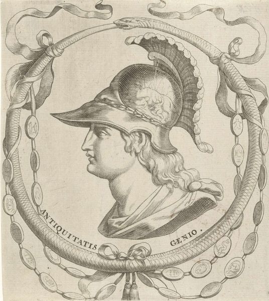 Curator: Oh, this print—it just crackles with such strange energy. Editor: Indeed. We're looking at "Buste van jonge vrouw met helm," or "Bust of a Young Woman with Helmet," an engraving by Everard Crynsz. van der Maes, likely created sometime between 1587 and 1647. Curator: That's a long window of time for its making... Makes me wonder if that also contributed to its mysterious character... There is something powerful but contained there, no? It's hard to place. Almost mournful, but proud. Editor: The use of line is quite masterful, isn't it? The varying thicknesses create a compelling contrast, highlighting the play of light and shadow on the helmet and the subject’s features, and its setting within a heavily decorated baroque frame adds a layer of structural complexity. Curator: Right, but I find that heavy frame almost comical, it's SO extra. I love that. But I keep getting drawn back to the young woman's gaze. It is steely and knowing somehow, despite its downward direction, despite its lack of seeing us! Editor: The helmet certainly hints at a martial subject. We might explore this through a close look at history paintings of the era; it also lends itself well to formal analysis as an opportunity to understand gender in the Dutch Golden Age. Curator: Maybe she's just borrowing someone's helmet to do some gardening! But, still… that frame. And that perfectly positioned, slightly mournful stag... All those small details add such depth... Makes you wonder what narratives are being obscured here... Editor: An excellent point. A piece like this opens up discussions not just of technique and history, but also questions around who gets portrayed, and how that shapes our cultural memory. It provokes us to question the role of art and image in identity-making. Curator: It’s intriguing how a simple print can generate such layered reflections, isn’t it? A testament to Van der Maes’s skill and the enduring allure of historical portraiture. Editor: Quite so. It compels me to return, again and again, to reconsider my relationship with lines and history and those images that once looked at the artists of the Dutch Golden Age, and that now, for the barest of moments, look at me.