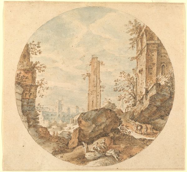 Carlo Fantaccini made this pen and brown ink drawing of an imaginary landscape in Italy in the first half of the 18th century. We see a romanticized vision of the past, filled with classical ruins overgrown with nature. The architecture alludes to the grandeur of ancient Rome, but it's presented as a picturesque ruin rather than a symbol of imperial power. This reflects the growing interest in antiquarianism and the Grand Tour among wealthy Europeans at the time, who sought to experience and collect artifacts from classical civilizations. The drawing’s circular format, along with its meticulous detail, suggests it may have been created for a print. Publishers at the time catered to the demand for images of Italy, and artists like Fantaccini found a market by creating views that could be reproduced and sold to tourists. To understand the drawing better, one might consult archives of printmakers and publishers of the time. The art historian’s role is to connect the artwork to its broader context and consider how it reflects the values and interests of its time.