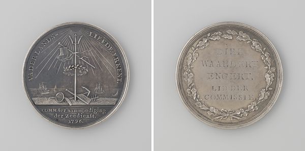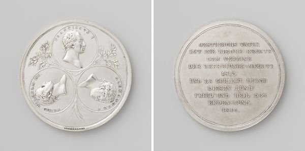 Curator: Let's discuss this striking bronze medal from 1832, entitled "Verovering van de citadel van Antwerpen" – or, “The Conquest of the Citadel of Antwerp". It's currently held in the Rijksmuseum collection. Editor: My first impression is how skillfully the artist uses the circular form. The dramatic scene feels almost contained, yet very intense, as if miniaturized, frozen mid-explosion. Curator: Absolutely. Hart, the artist, has captured this historical event with a keen awareness of classical traditions. Look at the material—bronze, a symbol of endurance—and how the relief is meticulously engraved, emulating ancient coins commemorating important victories. Consider the labor involved in minting these medals, their role in shaping public memory of the siege. Editor: I agree; however, the circular composition, divided into two distinct planes with a foreground focused on the Citadel and background exploding outwards, directs the viewer's gaze with precision. I find myself drawn to the small rooster atop the fortress—a powerful symbol rendered with such clarity! And the script, that beautiful, restrained script... Curator: Right, that script! On one side, it details the event, while on the reverse, it displays an inscription: "A Sainte Victoire, il fallait pour sa fête un bouquet de Lauriers". It suggests laurels offered to Saint Victory. This speaks to the socio-political context: King Leopold's forces, with French support, dislodging the Dutch garrison. A clear visual language for promoting national identity and victory! The circulation of such medals reinforced a particular narrative. Editor: A powerful observation! For me, it's how those meticulously rendered details, the smoke, the texture of the citadel walls—it's almost cinematic, but also serene. A contradiction, I know, but it adds to its compelling character. Curator: So, in viewing "Verovering van de citadel van Antwerpen," we both engage with Hart’s capacity to mobilize social context and celebrate historical feats. The tangible quality of the bronze interacts and creates memory, creating new visual relationships with an event frozen in time. Editor: And from a formal perspective, how Hart transformed an actual war scene into such a visually contained—yet deeply impactful— artwork. A moment of war is converted to art.
