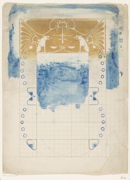 Editor: We are looking at "Decoratief ontwerp in grijsblauw", a drawing made with ink and etching on paper, placing it sometime between 1874 and 1945, by Carel Adolph Lion Cachet. It's an architectural sketch; very gray and quite geometric, almost abstract. What do you make of its structure? Curator: Its reliance on line is paramount. The grid is, of course, foundational, establishing order from which the "design" emerges. Consider, then, the composition itself – the tension created by the soft, organic shapes juxtaposed against that rigid matrix. Note also the limited palette. Gray and blue, distilled to their essence. Editor: I notice some other forms around the central design. Are those sketches too? What is their purpose? Curator: Observe their location. They exist outside the primary structural organization. One could argue these supporting images denote process, adding to the dialogue, hinting to additional visual details within the architect’s work. Perhaps these are part of the study, where one develops form out of the matrix. Note the use of line and tone. Editor: It almost looks like he’s developing a pattern, working with how the forms interact with one another. Curator: Precisely! It’s a study in relationships, form against form, tone against tone. A complex interplay. What do you think Cachet is exploring by this placement of shape and measurement, this juxtaposition? Editor: Well, it seems like a conscious decision to present not just the final design, but also the working process that goes into it. Curator: An astute observation. Do you notice the visual echo, or rhythm within those individual cloud-like forms and lines, in turn developing movement with in its structured form. It invites inquiry. This layering of line creates visual interest. Editor: This piece is starting to reveal even more! The contrast between rigidity and the organic shapes create a sense of depth. I appreciate the focus on the fundamentals of the design process. Curator: Agreed. And perhaps that's where its beauty lies: not in the creation of a defined image but its use of shapes and measurement for its design to flourish in a balanced harmony.