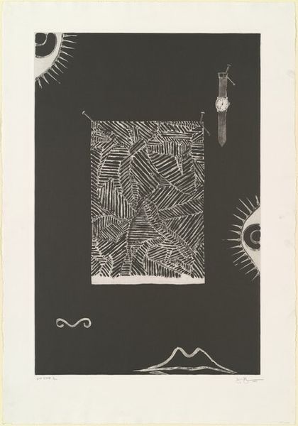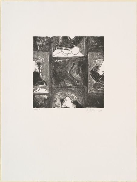 This 'Untitled (White Mezzotint) [trial proof]' was made by Jasper Johns using mezzotint, but we don't know exactly when. It's all about the surface here, isn't it? Look closely and you can see how Johns has worked the plate to create this velvety dark ground, scraping back into it to reveal these ghostly, luminous forms. The way the light seems to emerge from the darkness reminds me of those early photographic processes, but here, it’s all about touch. That face, smack dab in the middle, feels like it's trying to break through from somewhere else. You can almost feel Johns's hand moving, finding its way through the dark. There's a real conversation going on between figure and ground, a push and pull that keeps the eye moving. This print whispers, it’s a quiet, contemplative piece that invites you to slow down and really look. It's like Johns is saying, hey, let’s find the light together. Like Rauschenberg said: there is no poor subject.