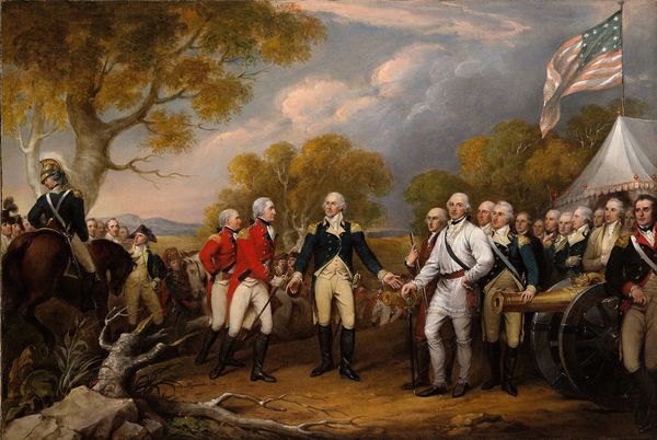 Benjamin West painted “Two Officers and a Groom in a Landscape” in the late 18th century, a period marked by significant social stratification and colonial expansion. The painting depicts two high-ranking officers in their resplendent uniforms, symbols of power and privilege, accompanied by a groom, whose subdued presence underscores the era's hierarchical structure. West, an American artist who gained fame in Britain, navigates the complex politics of representation. The officers, likely participants in Britain's colonial endeavors, are portrayed with an air of authority amidst a landscape that subtly hints at both the promise and the cost of expansion. The groom, a figure of labor and service, stands in stark contrast, reflecting the socio-economic disparities of the time. This painting invites us to reflect on the intertwined narratives of identity, duty, and empire, questioning whose stories are told and at what expense. It serves as a reminder of the human dynamics behind historical events.
