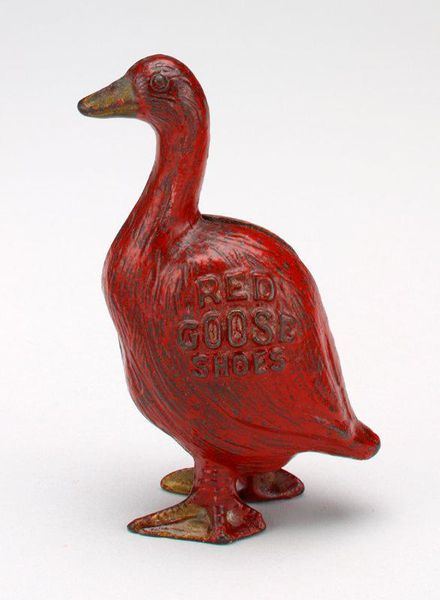 Editor: This intriguing object is called '-Red Goose Shoes- still bank' from the 1920s, made by Arcade Manufacturing Company. It seems to be an assemblage of metal and possibly ceramic, in the form of a goose. I’m struck by the texture and the way the red paint seems to emphasize the curves of the goose’s body. How do you interpret this work? Curator: Well, immediately I notice the power of branding – how an image, in this case a goose linked with shoes, becomes a potent symbol. Consider the deeper implications of a "still bank." What does it represent? More than a mere container for coins, it embodies aspirations, a cultural drive towards saving, a hope for future security reflected in an emblem of childhood and advertising. Editor: That's fascinating! The goose itself, painted a vibrant, almost assertive red… Is there something to be read in that, too? Curator: Absolutely! Red is loaded with symbolism. It can mean passion, danger, prosperity, revolution! And placing that colour on the goose… it would catch a child’s eye and their parent's. But what sort of psychological impact did these figures of commerce and domestic life imprint on people? What lasting echoes do these commercial images generate within society? Editor: So, it’s not just about shoes, but about something bigger – about our relationship with commerce. Thank you! This puts so much in perspective for me. Curator: Indeed. Consider this bank a sort of modern icon: an object mediating commercial and cultural meanings. Hopefully, it leaves listeners questioning what seemingly simple images reveal about cultural memory.
