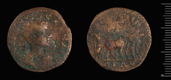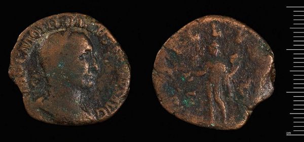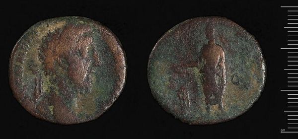 Editor: Here we have a Dupondius of Commodus. It’s incredible to consider how the material itself—the very substance of this coin—has survived so long. What strikes you about its composition and form? Curator: Notice the patinated surface, a testament to time's transformative power. The incised portrait and figure reveal a sophisticated understanding of relief. How does the circular format influence your perception? Editor: I suppose it focuses the eye, containing the narrative within a defined space. Curator: Precisely. And consider the texture—the smoothness of the high points against the roughness of the corroded fields. This tactile quality invites a deeper engagement. Editor: It’s amazing to consider how much information is conveyed within such a small, formally constrained object. Curator: Indeed. The artist's manipulation of form and texture elevates the coin beyond mere currency.