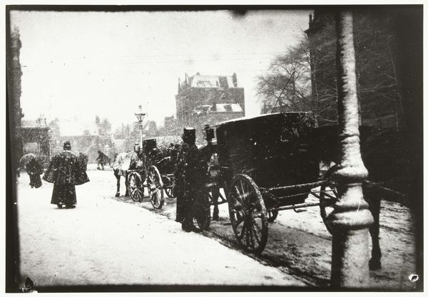 Curator: Let's talk about this gelatin silver print, dating back to 1898. It's titled "Autocoureur Prevost (Prevot), deelnemer aan de race Parijs-Amsterdam, in zijn automobiel (vermoedelijk) te Nijmegen." It depicts, as you might guess, a race car driver, likely during a stop in Nijmegen during the Paris-Amsterdam race. Editor: Immediately, I'm struck by the textures. The crispness of the architectural details contrasted against the soft focus on the crowd. It gives you a real sense of being present. Curator: Exactly. The technology behind gelatin silver prints was still fairly new at the time, giving rise to photographers who wanted to show off the progress of technology. This photo not only documents that, but, situates that technology and this white male racer, within a nexus of societal expectations and early modern European social circles. The rows of onlookers tell a bigger story, as does the stately architecture in the background, serving to further demonstrate an elite context. Editor: You can also tell a story just by considering the construction of that automobile. All those spokes on the wheels! That's labor; skilled labor involving raw materials, craftsmanship... the image is as much about making as it is about speed. We often neglect the process involved in constructing these early vehicles. It speaks to an entire chain of production. Curator: Absolutely. We must recognize the socio-economic factors influencing these so called 'innovations'. Early car ownership was undeniably elitist, excluding most people. In order to produce images, access was granted to some and denied to others. Consider also the implications this photo may have held as a catalyst for white European modernity in an era of colonial expansion and rapid technological growth. Editor: It is interesting how photography's rise dovetailed with early industrial expansion. The image is quite small and precise, but it almost screams "look at this marvel of material progress, made by human hands!". One almost senses pride in the machinery of the day through it's visual framing within this social sphere. Curator: Indeed, though a careful read exposes deeper and more problematic power dynamics embedded in technology, gender and early modernization, which persist today. Editor: That is, certainly, the nature of critical analysis. Curator: Well put.