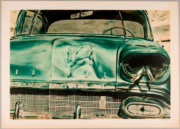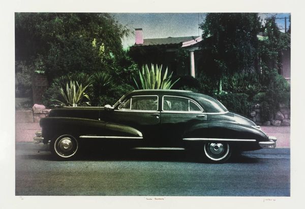 Editor: So, here we have "Mary Girow's Cadillac," a photograph from September 1956. There’s something about the color and the angle; it almost feels staged. It's like a faded dream of the American mid-century. What strikes you about this piece? Curator: What I see is an artifact deeply embedded in its historical context. The Cadillac, especially in that color, signifies a very particular aspirational ideal of 1950s America, right? Think about postwar prosperity, gender roles, and consumerism. Who do you think Mary Girow was? What does it mean to name the photograph after her instead of simply calling it "Cadillac"? Editor: That's a good point. The specificity of the title does feel like it’s making a statement, locating the car in someone’s personal narrative. Is this a critique of car culture and materialism? Curator: Possibly, but I see a more nuanced commentary. Whose narratives were prioritized and whose were erased? Think about the power dynamics implicit in owning such a vehicle in 1956. Was Mary part of that power structure, or outside it looking in? Also, what does the off-center composition suggest? Is it destabilizing that ideal? And that discarded cup on the ground introduces an element of waste or imperfection, which really jars with the clean lines of the Cadillac. Editor: So, it’s not just about the car as an object of desire, but about who gets to participate in that dream and at what cost. That tension between aspiration and reality seems to be central here. Curator: Exactly. It pushes us to consider whose stories get told and whose get overlooked in the broader narrative of American progress. By putting Mary’s name to it, there is almost an active, critical dialogue. Editor: I never would have thought of it that way! Now I see that it is way more layered and critical. Curator: Indeed! It’s about acknowledging that every object, especially one so loaded with symbolism, carries a complex story about power, identity, and belonging.