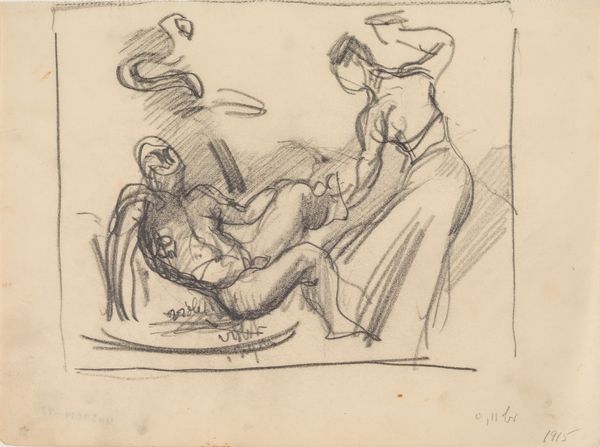 This sketch, *Kompositionsskitse. Hakon Jarls Sønneofring?* by Karl Isakson, seems to be made with charcoal or graphite on paper. It's all about the gesture, isn't it? You can see Isakson feeling his way through the composition. I love how the figures emerge from a flurry of marks, especially the draped figure in the foreground. The marks are light and dark, confident in some places, tentative in others, and you get a sense of the artist thinking through his process. There's a real physicality to this drawing, a beautiful contrast between the solidity of the forms and the ethereal quality of the marks. It reminds me of Kathe Kollwitz, who had that same capacity to imbue charcoal with so much emotional resonance. It's like Isakson is inviting us to witness his creative process. Ultimately, art is always a conversation, and it’s up to us to keep it going.