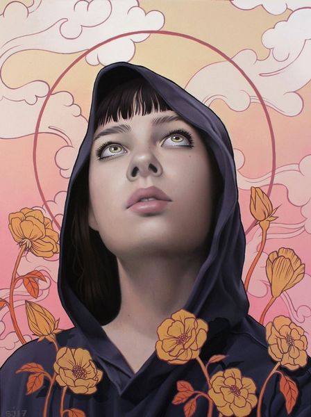 Editor: This is "Miren Rodrigo Pildain" by Yuschav Arly, and it looks like it is a digital painting. The geometric shapes around her create an interesting, almost pixelated, atmosphere. How do you interpret this portrait? Curator: Well, immediately the geometric shapes read as very digitally native. But what’s interesting to me is the use of classic portraiture in a clearly postmodern image. These Tetris-like blocks are overlaid and, in essence, dissecting a traditionally rendered face. The digital overlay becomes an interesting parallel to modern identity; do these shapes represent the fractured and multi-layered identities we curate online? Editor: That’s a great point about the dissected identity! It’s almost like the digital world is imposing itself onto this very classically rendered figure. Do you see any other tensions or contrasts in the work? Curator: Absolutely, there is a deliberate anachronism here – something old meeting something new. Note the color choices too, and what feelings the artist evokes, using what is essentially a very simple, very elementary visual language. Almost child-like. Why do you think Arly is placing an almost Renaissance-era subject within the kind of gaming and coding visuals that are typically reserved for children? Editor: Maybe it’s about how these supposedly simple, child-like digital tools are now integral to our sense of self, and that connection affects all ages. I think I am starting to see the symbolic weight in the retro design combined with modernism here! Curator: Precisely! I am glad we explored those historical threads. It allows us to unpack the cultural assumptions that we automatically bring to this image.