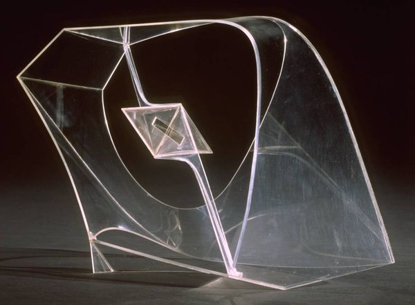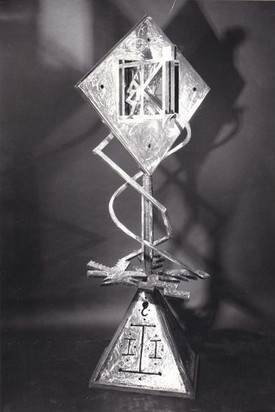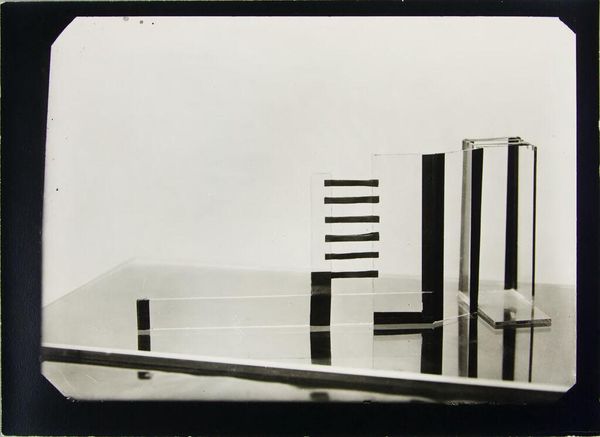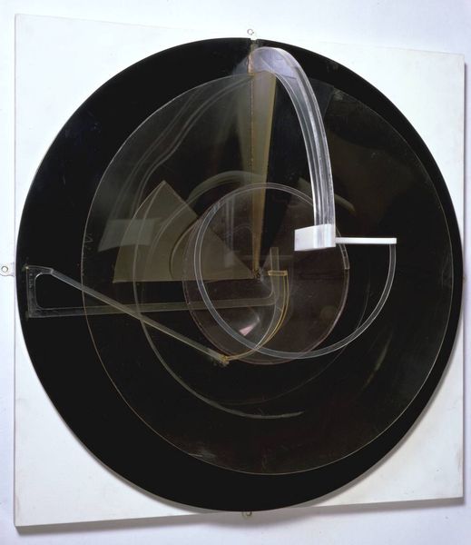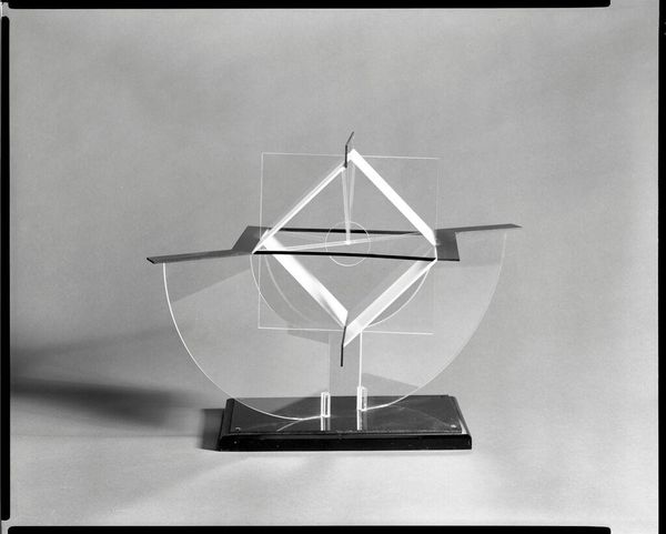 Curator: Before us, we have Carl Chiarenza’s photogram “Albers Disked 235,” created in 1998. Chiarenza was renowned for transforming ordinary materials into striking abstract compositions. What are your initial thoughts? Editor: Immediately, the interplay of light and shadow grabs me. There's this dynamic tension between the severe geometry of the darker shapes and the gleaming curvature of the disk. It's almost a study in contrasts—rigid versus fluid, dark versus light. Curator: Yes, Chiarenza, a student of Minor White, explored how abstraction could evoke the turbulent social environment that defined America. Chiarenza frequently combined found objects. In this work, we are given a circular surface and darker quadrilateral objects which may relate to Albers’s Homage to the Square paintings that he developed from 1949 until 1976. Editor: Interesting. What strikes me is the tension created by the texture and the tears on the rigid shapes in contrast with the implied industrial coldness of the reflective disk, generating both beauty and chaos. There is the perfection of form on one hand but imperfect edges of something either constructed from trash or slated to be thrown out. Curator: Absolutely. His photograms weren’t merely aesthetic exercises but powerful statements that transformed detritus. The artist's intention was to provoke us to question established values during periods of war and social protest, suggesting what once seemed solid could be in danger of collapse. Editor: I can see that. And formally, the composition pushes beyond pure abstraction. The placement feels intentional, generating an uneasy sense of balance with dramatic results. The artist achieves remarkable depth using solely shades of grey to show, for example, which of the black quadrilaterals are in front and which are behind each other, giving the picture another layer of intrigue. Curator: I see that his approach resonated with the socially engaged artistic practices from the ‘60s. He worked, as seen here, to critique norms and power structures of the time. His approach transformed perceptions and invited viewers to question, prompting dialogue and inciting social change. Editor: Looking at the texture and the forms, this work’s formal arrangement feels fresh and surprisingly urgent even today. It's really quite compelling. Curator: Yes, "Albers Disked 235" certainly encourages us to reflect upon how art is always influenced by and speaks to shifting societal structures.