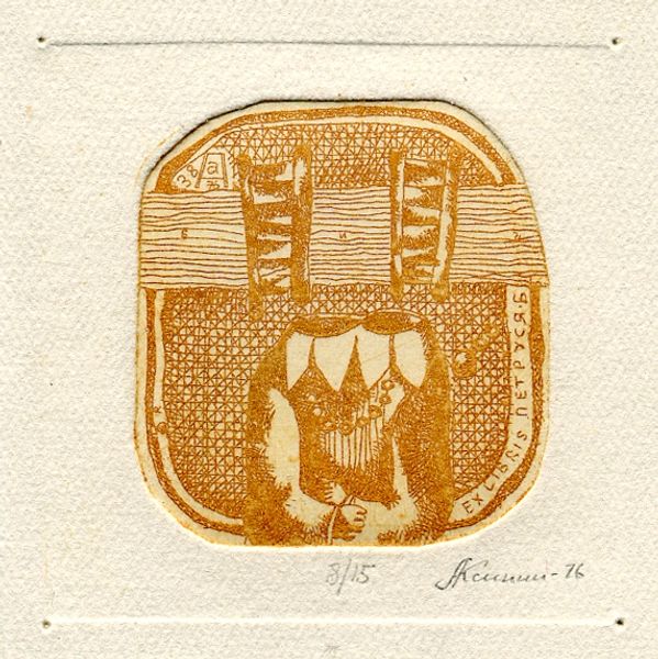 Curator: This is “Exlibris G. D.”, a graphic art print made in 1974 by Oleksandr Aksinin. Editor: Well, that's immediately whimsical. The drawing is dominated by a squat elephant rendered in an almost diagrammatic style. The rough-hewn lines add to the charm, and is that a peace sign on one of its legs? Curator: It is! Aksinin was working in Soviet Ukraine at the time. His style blends elements of surrealism and folk art, often with coded symbolism reflecting the socio-political context. These ex libris prints, essentially bookplates, allowed artists like Aksinin to express themselves more freely. The limited scale circumvented tighter control imposed on larger, more public artworks. Editor: So this playful exterior hints at something deeper. I find the elephant, weighed down by a bundle marked in Cyrillic, especially evocative. What’s the significance of the train at the bottom with "Ex Libris G.D." written on its cars? It's like a tiny, hopeful caravan. Curator: The "Ex Libris" indicates this was a personal bookplate designed for someone with the initials G. D.. The elephant, a symbol of memory and wisdom, combined with the packed bundle— “book with a burden" the Cyrillic roughly translates to—suggests the weight and importance of knowledge, perhaps knowledge under duress. Editor: The burden of knowledge. It makes me think about what was deemed permissible to read and share under Soviet rule. Aksinin sneaks in subversive gestures in an accessible way. It is subtle, yet very profound, as well. Curator: Absolutely, and it highlights how art becomes this vehicle for quiet resistance. Even in something as unassuming as a bookplate. Editor: It’s amazing how a small piece like this, born of a specific historical moment, can still speak volumes today about freedom, expression, and the power of symbols. Curator: Precisely. Art as a silent language, still carrying stories across time and cultures.