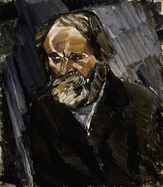 Editor: So this is Ferdinand Hodler’s "Self Portrait," presumably from 1916, judging by the inscription. Painted with oil paints, it has an intense and brooding presence. What do you see when you look at it? Curator: The gaze is certainly arresting. The eyes, level and direct, confront us. Given its creation during the First World War, one cannot ignore the potential symbolic weight. Do you find the rendering of the face naturalistic or exaggerated? Editor: There's definitely an intensity in the coloring that feels exaggerated, heightened perhaps. It makes me wonder if he's trying to convey an internal state. Curator: Precisely! The ruddy skin tones could symbolize vitality or perhaps a feverishness of spirit, mirroring the turmoil of the age. The beard and tie almost blend together. Does that visual blending evoke any feelings? Editor: Maybe a sense of blurring, as if identity itself is becoming less clear-cut during times of upheaval. Or a stuffiness? Curator: An excellent observation. It can represent the psychological experience of a generation facing unprecedented societal transformation and crisis, searching for meaning and stability. Even the seemingly simple choice of clothing, while formal, is muted, lacking in ostentation. Hodler gives us a study in confronting one's mortality through self-representation. What lingers with you? Editor: Definitely that piercing gaze, the rawness of the color… It’s a really powerful expression of humanity in crisis. Curator: Indeed. And understanding those cultural symbols allows us to see art history's lasting echo through generations.