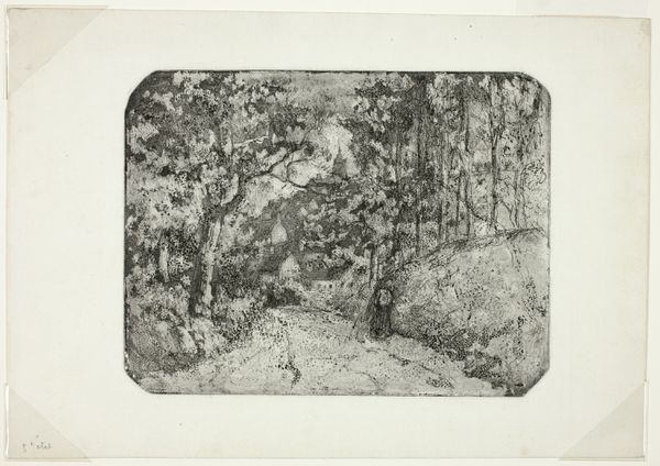 Editor: This is Camille Pissarro's "Path in the Woods at Pontoise," a print housed at the Harvard Art Museums. The textures are really striking. What social commentary can we draw from a seemingly simple landscape? Curator: Pissarro, though known as a father of Impressionism, engaged deeply with anarchist ideals. Consider how representing the rural landscape could be a commentary on industrialization and the growing urban centers. Can you see a connection between the figure in the path and the idealized peasant celebrated by anarchist thinkers? Editor: I hadn't thought of it that way, but it makes sense. It's more than just a pretty scene. Curator: Exactly. Pissarro's work often subtly championed the dignity of rural life against the backdrop of rapid social change. It urges us to consider the political implications inherent in landscape art. Editor: I'll definitely look at Impressionism differently now. Thanks! Curator: My pleasure! Seeing art through a critical lens always reveals new depths.