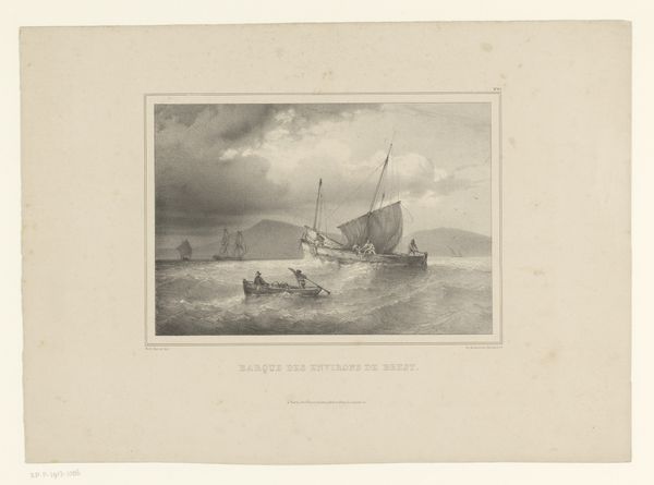 Editor: Here we have Barend Cornelis Koekkoek’s "Visserboten aan de kust" from 1830, a print executed with etching and engraving techniques, held here at the Rijksmuseum. It feels incredibly tranquil, yet there's a human element in all of it. What jumps out at you when you see this piece? Curator: What truly catches my eye is the scene’s poetic realism, you know? Koekkoek captured not just boats, but the spirit of a seaside community; I bet those salty breezes tickled his nose, just as they do ours! Observe how light plays with those clouds—romantic brushstrokes—against the grounded realism of daily coastal life. Almost a stage set for the theater of life, isn’t it? Editor: It's interesting that you see it that way! The 'stage set' point. Are you saying he may have romanticized reality a little? Curator: Absolutely! While realism is present, note how serene it is, a tad idealized perhaps? Koekkoek isn’t merely copying nature, my dear. He's selecting, enhancing... composing! Consider how the human figures interact. What narratives do you see whispered across that sandy stage? Editor: Now that you mention it, they do look posed... perhaps frozen in time for the sake of beauty? I hadn't thought of it like that, that realism can still be manipulated to convey a certain message. Curator: Exactly. These early 19th-century artists wanted more than just photorealism, and in many respects were far away from it still - think more about how a landscape could tell a story, embody feeling. Art mirroring life... or perhaps, life aspiring to the canvas? Thank you for the journey - I see art freshly again.