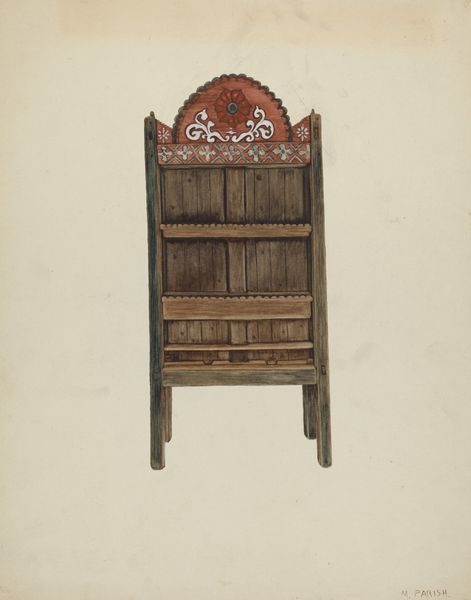 Howard Weld made this watercolor of a chair, though it kind of looks like two chairs, or a chair and a headboard. It’s hard to say exactly when, but Weld lived a long life, so it could be anytime in the 20th century. The drawing is so precise, almost diagrammatic, with these neat stripes of golden paint running along the dark wood of the frames. The shapes feel solid, but also a little like a flat-pack furniture manual; here’s how the parts slot together. Look at the fruit, maybe grapes, and leaves at the top of the headboard. They're rendered with tiny flicks and dabs of colour. It’s kind of amazing how the artist gives it depth and roundness through those tiny marks. There's something so charming about the way this picture balances realism and representation. It kind of reminds me of the formal qualities in the paintings of Giorgio Morandi, domestic and slightly odd. It’s a beautiful, quiet thing.