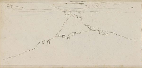 Curator: Let’s turn our attention to this evocative drawing: "Berglandschap met een kasteel aan een meer," or "Mountainous Landscape with a Castle by a Lake," rendered in ink on paper by Johannes Tavenraat around 1840. It resides in the Rijksmuseum. Editor: It's incredibly airy! It feels almost like a fleeting thought, sketched out before it vanishes. I imagine someone jotting this down during a brief moment of inspiration on a grand tour. Curator: That’s an interesting observation, grounding it in travel. Tavenraat lived from 1809 to 1881, and this work certainly aligns with the Romantic era's fascination with landscape and the sublime. Consider the implications of the castle perched high on the mountain's flank—a symbol of power, perhaps, but also vulnerability to the forces of nature. What's its role within these sweeping slopes? Editor: That's key: that little building! It looks so forlorn, overshadowed. Like it's trying to stand up to the immense, impersonal mountain. And below, almost as if it fell off of the slopes, we see the same loneliness with a tiny village hugging the lake's edge. I can’t help but think that these two human representations may well represent us and our personal struggles. Curator: It does conjure a sense of vulnerability, which aligns with Romantic ideals of human insignificance amidst the vastness of the natural world. Think of Caspar David Friedrich, for example. These are visual articulations of that philosophical era's grappling with identity in relation to its environment. Also notice how the drawing has captured the social landscape of the time, which was still dominated by the relics of European aristocracy, whose status were on very shaky ground in 1840, and it does it almost without commentary. Editor: Yes! Almost indifferent commentary... I also keep coming back to that line work. The lines themselves appear frail, unfinished almost, which feels like Tavenraat really trying to show the insignificance you’re talking about. Like the scene exists only as long as our memory of it does. It also seems, however, very light on message. Just enjoying the scenery for the view's sake! Curator: It is indeed interesting to consider the interplay between direct representation and Romantic ideological undertones within Tavenraat’s choice of subject, scale, and particularly the execution of this work. Thanks to ink and paper, it certainly stands at a point of intersection, offering us views on social norms through personal artistic creation. Editor: Absolutely! Now that I better see and appreciate it, the quick, unassuming quality is also its enduring magic. The eye wanders...