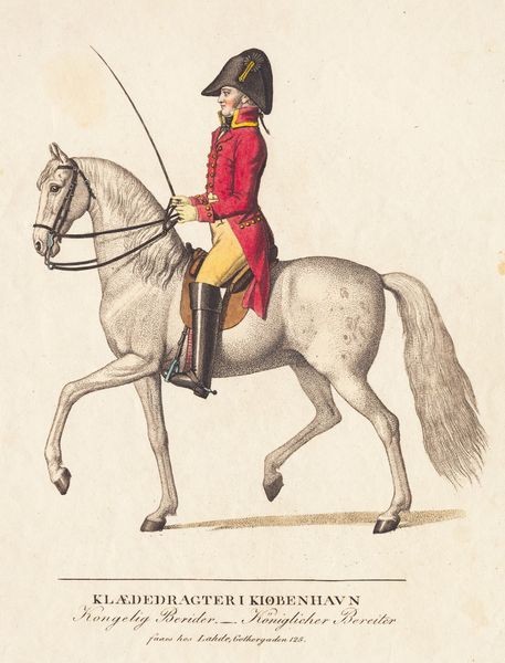 Editor: This watercolor drawing, "Kongelig Stafet," made in 1807 by Johannes Senn, is interesting! I'm struck by how crisply rendered the rider and horse are against such a simple background. It feels very poised, almost staged. How would you interpret this work? Curator: The visual language here evokes both power and vulnerability, doesn’t it? Consider the symbolism inherent in the rider’s attire. The bright red uniform with ornate detailing suggests authority and valor, deeply embedded in a military context. But then, look at the delicate, almost melancholic, expression on the rider’s face and consider the frenetic, yet graceful, movement of the horse. Editor: I see what you mean. The horse is mid-stride, full of energy, while the rider looks almost…resigned. Is there a story being told in those contrasts? Curator: Perhaps a story about duty and constraint. Horses often symbolize freedom and unbridled passion, yet here, it's clearly under the control of the rider. What about the baton-like object he carries? Consider, what meaning would a 'royal relay' or baton convey in that historical period? Editor: It really emphasizes the role and responsibility of the individual within a larger structure, the ‘Kongelig’ suggesting the Danish Royal family, then. It gives a face to the more abstract notions of duty and service to the monarchy. I hadn’t thought of it that way! Curator: Exactly. And by stripping away excess background detail, the artist draws our eye to the figure as a representation of something greater than just an individual on horseback. It also immortalizes the relationship between citizens and crown at that particular time. Editor: So it’s not just a pretty picture, it’s a kind of… snapshot of a cultural dynamic! I never would have looked at it that deeply on my own. Curator: Indeed! That's the beautiful thing about delving into the iconography.