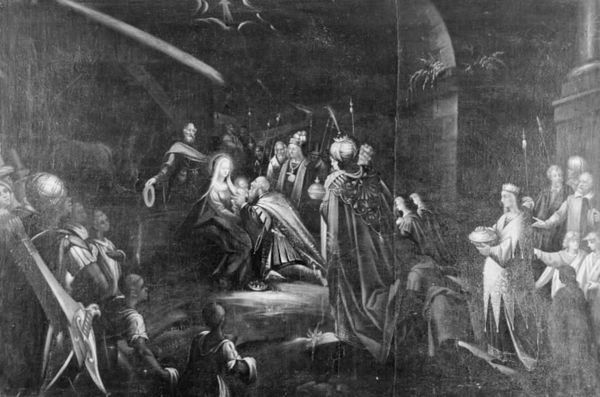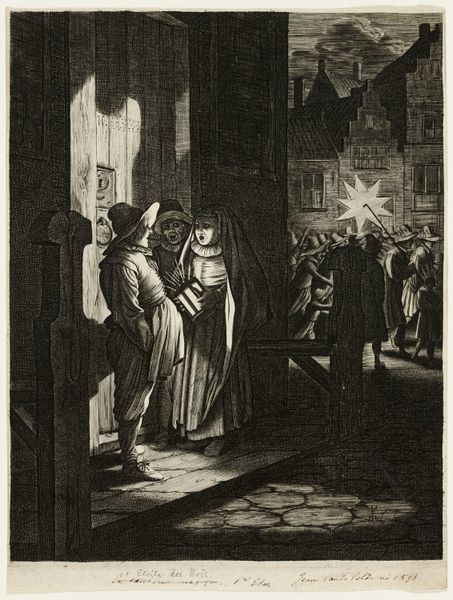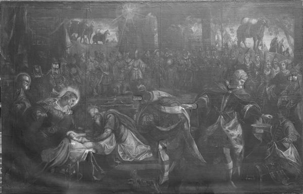 Editor: Here we have Willem de Poorter's "King Ezechias," created sometime between 1623 and 1648. It's an oil on wood painting. The monochrome palette makes it feel quite somber, and there's a fascinating asymmetry in the composition. What do you see in this piece, looking at it through a formalist lens? Curator: Initially, the composition arrests our attention. Note the interplay of light and shadow. The artist masterfully utilizes chiaroscuro to guide the viewer’s gaze. Observe how the architectonic archway in the background is juxtaposed with the figures clustered in the foreground. This intentional placement invites a deeper exploration of spatial relationships. Editor: The contrast between the rigid architecture and the more fluid forms of the people is striking. Does that contrast mean anything, in your view? Curator: Perhaps, or it could be merely aesthetic, meant only to create visual interest, and the use of the monochrome, in and of itself. We are left to consider whether it underscores a sense of gravity, an austere moral tone. Furthermore, consider the pyramidal structure of the figures. Do you perceive how the arrangement anchors the composition? Editor: I do now that you point it out! And that low-crawling figure and gleaming metal object break that strong symmetry, but draw your eye right down. Curator: Precisely. De Poorter disrupts any easy symmetry, forcing our eye to complete a visual journey. Editor: So, focusing on these formal elements first allows a more nuanced understanding, instead of immediately diving into historical context? Curator: Precisely. Understanding composition first may give a better indication into meaning and content of history paintings like this one.