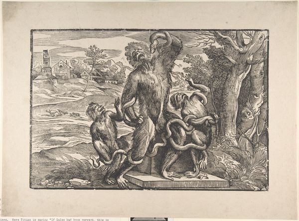 Curator: Nicolo Boldrini's "Caricature of the Laocoön," located at the Harvard Art Museums, presents a rather peculiar scene. What's your immediate take on it? Editor: Utterly bizarre! It's like a grotesque satire. The figures, seemingly apelike, are contorted in agony. The whole scene feels… mocking. Curator: It is, isn't it? Boldrini cleverly subverts the classical Laocoön, a symbol of suffering and heroic resistance, replacing the figures with apes. What do you think this substitution suggests about the public role of art at that time? Editor: Perhaps Boldrini is commenting on the perceived pretentiousness or the elevated status of classical art. By transforming it into something absurd, he democratizes it, bringing it down to earth, so to speak. It definitely highlights the politics embedded in imagery. Curator: It's a powerful deflation of established iconography. By tapping into the readily understood image of Laocoön, he provokes questions about the cultural significance we assign to certain figures and narratives. Editor: Absolutely. It makes you wonder about the societal values being critiqued through this comical distortion. I find it unsettling and fascinating. Curator: Indeed, Boldrini's caricature challenges us to reconsider the weight we place on cultural icons. Editor: A memorable distortion offering many avenues for interpretation!