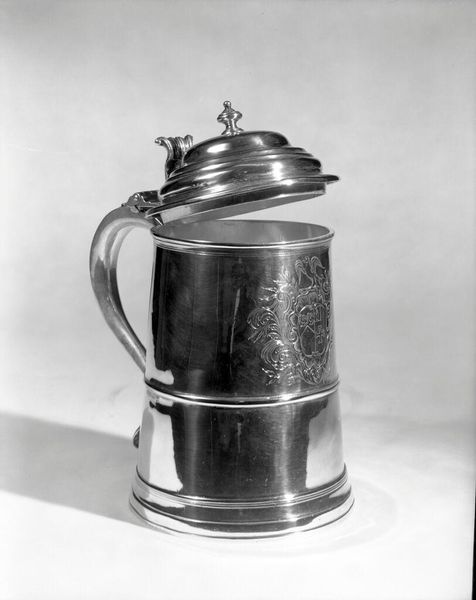 This is a silver sugar bowl made by Bailey and Kitchen between 1830 and 1846. It is an object of considerable structural interest. Notice how the geometric form is defined by its octagonal facets, a design choice that subtly plays with light and shadow across its surface. The handles, simple curved lines, offer a contrast to the bowl's angular body. The decoration is also carefully considered. Bands of repeating motifs, circles enclosing crosses, create a rhythm around the top and base, adding a layer of complexity to the otherwise smooth silver. This pattern functions as a sign, denoting luxury and craftsmanship. The lid, with its simple knob, mirrors the body’s geometry while maintaining a distinct presence. The bowl's shape and ornamentation can be interpreted as a dialogue between classical forms and emerging industrial aesthetics. It engages with ideas around functionality, beauty, and social status, and the bowl should be understood as part of a cultural discourse that assigns meaning to domestic objects.