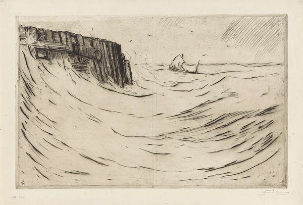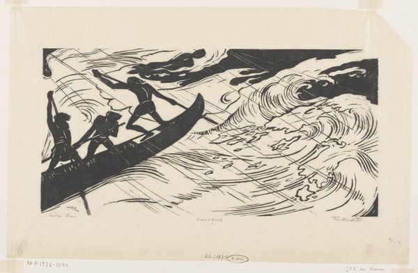 Curator: Leo Gestel's drawing, "Seagull and Steamship at Sea," likely created sometime between 1891 and 1941. It is executed in ink on paper. What are your first impressions? Editor: Bold! Stark. The high contrast between the black ink and the paper definitely gives it an almost woodcut feel, despite the medium. There’s a powerful graphic quality to the strokes depicting the water. Curator: It does feel rather graphic. Notice how the image simplifies both nature and machine; the steamship almost feels secondary to the powerful wings of the seagull, its presence evoking themes of freedom versus industrialization. Editor: Absolutely. I wonder about the kind of paper used here. You see slight variations in the ink density which points to a certain absorbency; the final texture is very distinct. Also, considering the time, the mass production of paper, as opposed to handmade, could say a lot about the changing nature of art accessibility. Curator: Interesting point about accessibility. To me, this starkness lends itself to a feeling of the sea as indifferent to human progress, evoking a vast and sublime confrontation with nature. The bird, rendered almost as a caricature, might signify the soul, or a connection to an older, more spiritual world disrupted by the industrial revolution symbolized by that very solid steamship. Editor: Perhaps. Or perhaps the artist's access to commercially available ink impacted the deliberate style and overall thematic construction we interpret today. It's interesting to consider how everyday materials affect grand visions! The thickness of the lines feels intentional; that's a deliberate choice made easier because mass manufacturing offered wider markers than traditional quills. Curator: I see what you're getting at, in terms of materiality guiding perception, while I also feel that the artist is drawing from a deeper well, into an ocean of symbols around nature and the impacts of modernity. It’s such a dynamic conversation between symbolism and the materials in use. Editor: Definitely food for thought. Thinking of the constraints of materials in shaping cultural forms... Curator: Absolutely!
