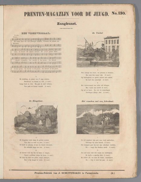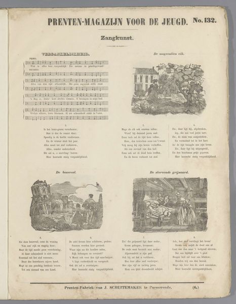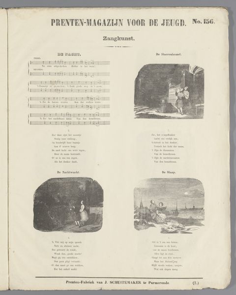This print, ‘De Avond’ or ‘The Evening’, was made by Jan Schuitemaker as part of a series called "Prints Magazine for Youth." The print presents a combination of text and images related to the theme of evening, reflecting cultural values and social practices of the time. Made for youth, this print served an educational purpose, fostering literacy and an appreciation for art and music. The inclusion of sheet music alongside images suggests an integration of artistic disciplines, encouraging viewers to engage with the material on multiple levels. It was produced by the 'Prints Factory of J. Schuitemaker' in Purmerende. This highlights the role of industrial production in disseminating art and educational materials to a wider audience. To properly understand its cultural significance, further research into the history of Dutch education and printing practices in the 19th century is necessary. Only then we will be able to place its production and social context.