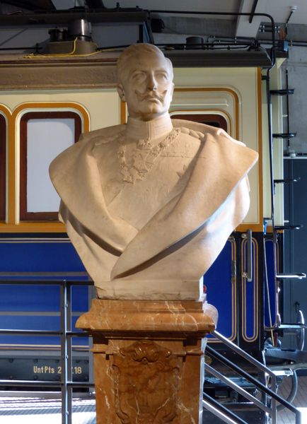Curator: This imposing marble figure of Kaiser Wilhelm I, crafted by Ludwig Manzel, resides within the Grunewald Tower. It strikes a powerful, almost defiant pose. Editor: Yeah, imposing is definitely the word! He gives off serious "Don't mess with me" vibes. All that stark white marble against the brickwork is… dramatic, to say the least. Almost feels a bit ghostly. Curator: Wilhelm's image here isn't simply a likeness, but an intentional evocation of leadership. He embodies the strength and gravitas associated with the German Empire through very deliberate iconography. The marble, of course, connects to the classical tradition. Editor: Oh, totally, it's giving me Roman emperor vibes – all that "eternal glory" stuff. But it's also interesting how the surrounding space, with its stained glass and those ornate ceilings, almost softens that austere feeling. He is standing in a weird brick portal, if you think about it. Curator: Yes! The Grunewald Tower, in many ways, amplifies Manzel's intention. It's designed to celebrate German history and national identity, providing this particular figure with context. The space isn’t simply decorative but an active element. Editor: I keep thinking about how time affects our perception of these historical figures. Today, an artwork like this prompts some… complex feelings, shall we say? This image comes charged with so much baggage, so to speak. Curator: Indeed. We're now at a distance that invites critical re-evaluation, including all the burdens associated with German history. Public art is really never neutral in this way. The weight of the past seems quite present in these symbols. Editor: Well, I definitely won't forget my encounter with this stately specter! So glad to get a little background. Curator: Me too! Hopefully listeners now have fresh insight into the work.