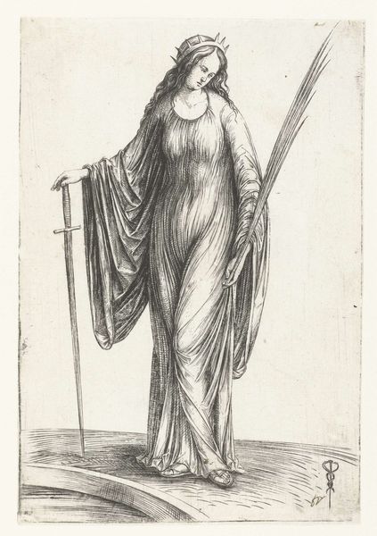 Curator: Here we have Jacopo de' Barbari’s "Judith with the Head of Holofernes and Sword," likely completed sometime between 1460 and 1504. It's an intaglio print, a kind of drawing, really, done with pencil. What are your immediate impressions? Editor: There's a subdued, almost melancholic air about her. She carries the weight of her act—the lines are so delicate, giving a sense of introspection rather than triumph. Curator: Judith is a powerful figure, particularly as depicted during the Renaissance, offering a complex symbol of resistance, religious conviction, and, of course, gender. How do you see her role portrayed here, considering she is holding both the head and the weapon? Editor: The sword acts almost as a support, physically and symbolically. It speaks of what she needed to use, her necessary instrument of agency in a patriarchal world. And the head, it’s not a trophy but a heavy burden, its details rendering Holofernes almost pitiful. I am drawn to her gesture and expression - a deep introspective reflection in what she has been pushed to do to fight the oppressor. Curator: Indeed. Notice how Barbari utilizes classical forms and themes within the context of a religious narrative. It’s a potent mix of virtue and violence, presented at a time of great socio-political upheaval. We must look into those circumstances of vulnerability in which violence presents itself as a viable response. Editor: I agree. The drapery hints at classical sculpture, the symbol itself almost recalls depictions of saints with their attributes. It invites us to delve into those complexities and consider how cultural memory and historical continuity influence our perceptions of power. The contrast between Judith’s graceful stance and the gruesomeness of her deed also echoes the conflicts between the ideal and real that mark the era. Curator: A fantastic perspective. By looking at the symbol of Judith—her story, her contexts—we open dialogue around justice, power, and resistance that absolutely still resonates. Editor: It’s fascinating to consider how symbols, like Judith, evolve and shift over time, always holding a mirror up to our contemporary anxieties and aspirations.