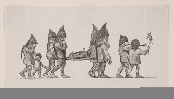 Editor: So, this is "Marcherende poppen in uniform," created in 1898 by Willem Wenckebach, using ink. These little wooden soldiers marching along look quite stern, considering they're toys! What strikes you about this drawing? Curator: I see a fascinating commentary on the industrialization of warfare. Notice how Wenckebach employs simple lines to render these toy soldiers. The starkness, the repetitive nature…it all speaks to the mass production and dehumanization inherent in military systems. How does the artist use the ink itself to convey this message? Editor: That's interesting! The ink strokes are quite uniform, giving them that mass-produced feeling you mentioned. Curator: Exactly! And consider the material itself—ink. Relatively inexpensive and easily reproduced, much like the propaganda churned out by nations to fuel militarization. It makes you think about the tools and resources that allow such grand-scale conflicts. What do you make of the almost whimsical design choices set against this serious backdrop? Editor: Well, there is that tension of the silly toys. It seems contradictory. Curator: Precisely. By choosing to represent soldiers as simple, manufactured toys, Wenckebach blurs the lines between play and the serious business of war. The drawing reminds us that even something as innocent as a toy soldier can become a vehicle for societal conditioning and, ultimately, participation in industrialized warfare. Editor: I hadn’t considered the materials as being part of that message. It’s given me a new way of seeing the connection between artistic process, materials and its overall social commentary! Curator: Indeed. By examining the work through its materials and means of production, we gain deeper insight into the artist's message about labour, war, and consumption.