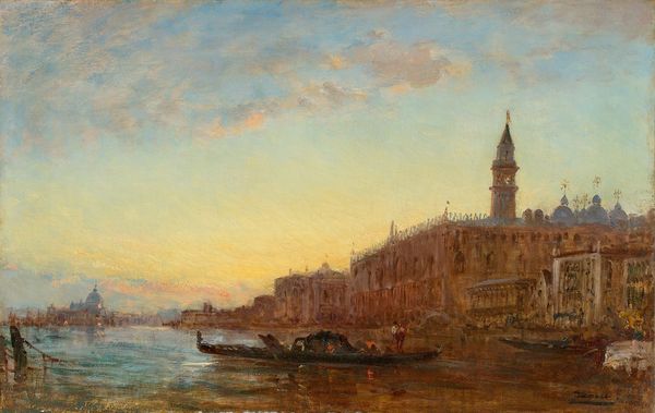 Félix Ziem painted this view of San Giorgio, Venice, using oil on canvas. Notice how the scene is bathed in a warm, diffused light, creating a dreamlike atmosphere. Ziem employs a composition that balances architectural solidity with ethereal light. The Doge's Palace and the bell tower of San Giorgio stand as vertical anchors, yet the scene dissolves into atmospheric perspective. This technique, which emphasizes light and color over distinct form, aligns Ziem with the Impressionistic sensibility. He invites us to consider how light itself shapes our perception and understanding of space. The brushwork is loose, suggesting a world in flux, rather than fixed. The sky, a mosaic of blues and whites, merges seamlessly with the water, blurring the line between the tangible and the transient. This manipulation of form destabilizes the certainty of representation, inviting a dialogue between the observed and the imagined.