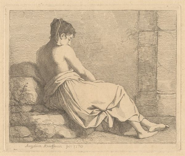 Angelica Kauffmann created this etching, "Reclining Girl Seen from the Back," sometime around 1780, using a copper plate. The sepia tones you see come from the etching ink that was rubbed into the plate’s fine lines. The pressure of the printing press then transferred the image to the paper. Etching is an indirect process. The plate is covered with a waxy ground, and the image scratched through that, exposing the metal. Acid is then applied, which bites into the metal only where it has been exposed. Because the artist isn’t directly cutting the line, as with engraving, etching allows for a more fluid and sketch-like effect. Note the comparative freedom of line in the girl’s drapery and hair, and the textures of the rocks she is sitting on. The printmaking medium was crucial to Kauffmann’s career. It allowed her paintings to reach a much wider audience, and this in turn amplified her fame. The etching process itself, involving skilled labor and mechanical reproduction, also speaks to the burgeoning culture industry of the late 18th century. It is a reminder that even seemingly intimate images like this one were caught up in networks of production and consumption.