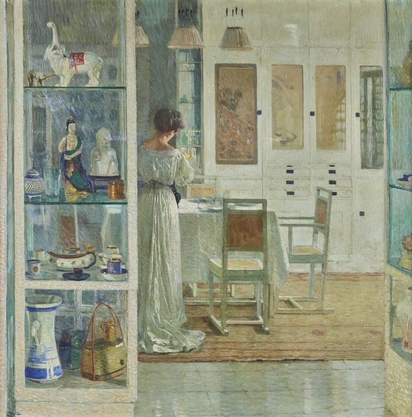 Carl Holsøe created this painting, "Woman in an Interior with a Mirror," using oil paint on canvas. As an artist rooted in the Danish tradition, Holsøe used the subtlety of oil to depict the textures and muted palette of domestic space. Consider the way light filters through the curtains, falling softly on the woman’s dress. The artist’s technique beautifully captures the delicate balance between light and shadow. The mirror reflects a partial view of the outside, providing depth and perspective to the space, and perhaps signifying the woman’s own reflections. This attention to detail and the careful rendering of light and form are testaments to Holsøe’s craftsmanship and the rich tradition of painting during his time. Paintings like this invite us to appreciate not only the subject matter but also the skill and artistry involved in bringing these scenes to life.