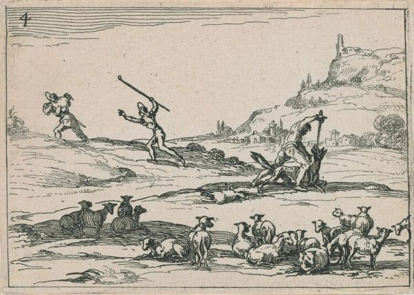 Anthony van Zijlvelt created this etching titled 'Haven met verschillende mensen rond een fontein,' or "Harbor with several people around a fountain," sometime between 1658 and 1715, a period marked by the Dutch Golden Age. The detailed print offers a glimpse into the bustling maritime culture, reflecting the Netherlands' prominence in global trade. Consider the social stratification depicted here: the laborers, their bodies bent under the weight of barrels, juxtaposed with a figure of leisure, his posture suggesting privilege. The fountain, adorned with a sculpture, stands as a classical, almost mythical counterpoint to the rough, everyday labor. What stories do we tell about who does what kind of work? In what ways does the print invite us to reflect on the relationship between labor, leisure, and the visual markers of social identity? The laboring class here, in contrast to the reclining figure, prompts us to consider how class is embodied and performed.