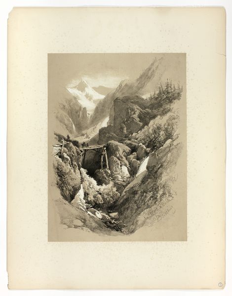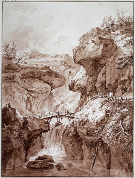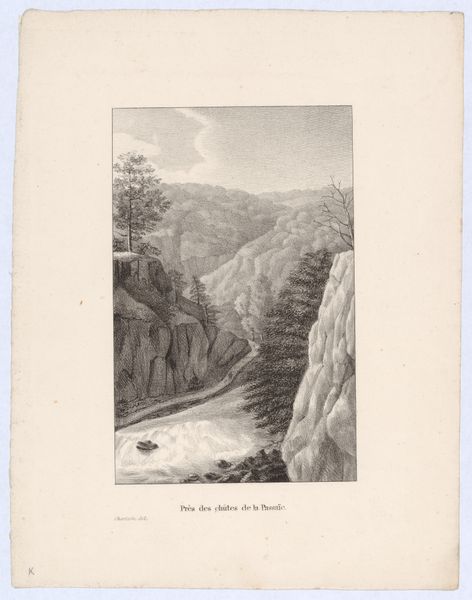Curator: Immediately, one is struck by the texture and movement within this print. Note how the artist uses engraving techniques to simulate light and volume on this imposing mountainside. Editor: It evokes a sense of solitude, doesn’t it? Almost unnerving with its stark contrast and the sheer scale of the falls relative to the almost imperceptible figures. Is that wildlife I spy near the upper reaches of the mountain face? Curator: Precisely, an interesting visual inclusion, given the composition. This piece, "Zicht op de Reichenbachwaterval," was crafted around 1820 by Constant Bourgeois. He utilizes meticulous line work to create gradations of light across the planes. Look particularly at how the white of the paper is exploited to accentuate the cascade, producing that vibrant, almost ethereal quality to the water’s flow. Editor: Bourgeois clearly attempts to capture nature's sublimity—but why reduce humanity to mere suggestions? Was it intentional commentary or artistic choice to heighten that sense of isolation we’re discussing? These landscape depictions became very popular in tourism and scientific study during this time. How do prints like this shape our understanding of Switzerland and what sort of nationalistic imagery were audiences seeing and consuming here? Curator: Certainly. Observe how the foreground is given as much careful attention as the background. The intricate network of lines articulates every crag and crevice, giving a tangible sense of the geological form, which prevents the piece from becoming solely reliant on depth-of-field tricks for its dramatic impact. In essence, form and space work harmoniously here, pushing the viewer to contemplate spatial depth using line variations, tones, and patterns in order to emphasize contrast between illuminated mist and rugged terrain. Editor: Absolutely! This piece showcases the power and control exercised in that technique; it presents not only a striking scene, but offers insight regarding human’s evolving relationship with landscape and nature. Curator: Indeed, one is drawn into both the fine detail of the artist's work and also given something visceral to ponder regarding nature’s overwhelming magnitude and the compositional rigor underpinning such a work. Editor: Quite so; studying prints such as these brings invaluable insights into that period's socio-artistic dynamics!