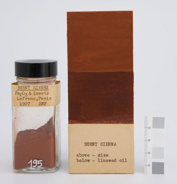 Curator: Looking at this "Antimony Vermilion" pigment sample, manufactured by Eimer & Amend, I'm struck by its quiet, almost somber presence. Editor: It's beautiful, isn't it? That muted, earthy quality makes me think of old frescoes, time and dust settling into the color itself. Curator: Precisely! The layered effect—the raw pigment versus its application with linseed oil—creates a compelling dialogue about transformation. Editor: There's something alchemical about it, like witnessing a material shift from potential to realized form. It’s restrained yet evocative. Curator: Agreed. Its value lies not just in its color but in the potential narratives it holds, from the artist's palette to the chemist's lab. Editor: Exactly. It reminds us how art and science are so deeply intertwined. It’s a study of color, form, and possibility all in one.