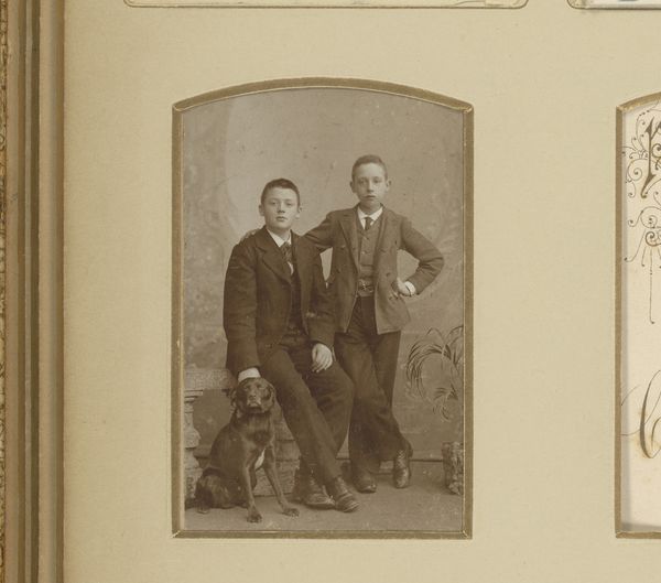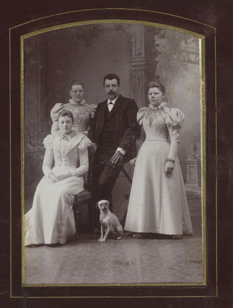 Curator: Looking at the gelatin silver print made somewhere between 1865 and 1896, currently held in the Rijksmuseum, we find Albert Dekema's “Portret van drie onbekende mannen en een hond”. Editor: My first thought is that dog has more character than the rest of the group combined. He’s definitely the focal point—alert, a little worried maybe? And I think those must have been some pretty stoic gentlemen. Curator: Yes, the dog does interrupt what is a highly structured composition. The tonal range within the gelatin silver print lends a certain depth. Observe how the three men, positioned at slightly different levels, create a triangular formation—a compositional technique that adds to the photograph’s inherent stability. Editor: It also traps them in place, though, doesn’t it? Everything’s so formal. It’s beautiful in its way—like an ancestor staring back at you from some slightly sadder dimension. But the backdrop is throwing me off, that decorative painting; its theatricality makes the whole thing feel strangely… staged. Curator: Precisely. The backdrop, while clearly artificial, provides context. Consider its relationship to the subjects’ formal attire; these visual cues tell us much about late 19th-century Dutch society and its concerns with representation and social class. The gelatin silver process also permitted greater detail. Editor: Right, every thread in those suits, every wrinkle. Even the dog's collar looks substantial. And their poses... a casual sort of leaning, each one touching some prop like they might bolt if they aren’t grounded somehow. They look like they are hiding their humanity behind props and convention. Maybe I am reading too much into it? Curator: Such layering can provide rich semantic opportunities. Do you find this interesting in relation to notions of collective identity? I agree. Editor: Absolutely. I can’t shake this feeling like I’m seeing a lost chord of history—one of those awkward moments before things turned messy. Anyway, the light is great. Curator: Indeed. It captures the spirit of the time in such a poignant and affecting method. Thank you for offering these valuable contextual notes on its content. Editor: Likewise. You’ve reminded me to examine more rigorously the architecture that defines every photo and piece of artwork that we see, which offers new methods of reading a composition, as always.