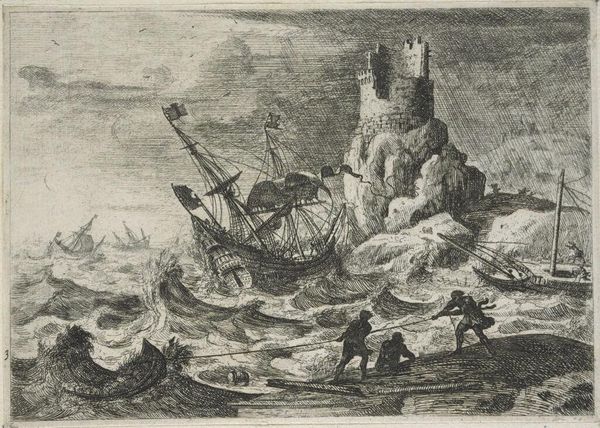 Editor: Here we have "The Shipwreck" by Claude Lorrain, created sometime between 1633 and 1646 using ink. Looking at the frantic energy of the waves, it evokes such a sense of urgency and chaos. What do you see in this piece? Curator: What I see is more than just chaos, it's a kind of sublime terror painted with incredibly delicate lines! Imagine Lorrain, grappling not only with portraying a disaster, but doing it through the controlled medium of ink. What does that tension create, do you think? It is as though we are distanced from the event even as we draw nearer. Editor: I think it almost heightens the drama. Like we're observing something catastrophic yet rendered with such precision. Are the ruins on the rocks historically relevant? Curator: Oh, absolutely! Ruins are practically characters in Lorrain's works. Think of them as symbols of lost empires, faded glory - reminders of how fleeting life can be against the backdrop of timeless nature. Editor: It's like nature is reclaiming everything, indifferent to human struggles. The small figures of humans underscore that feeling of impermanence so clearly. Curator: Precisely. Each tiny line and curve communicates such emotional impact. And I am beginning to think it a kind of hopeful despair-- an optimistic doom. Editor: Now I get it! Thanks for untangling my feelings! Curator: And thank *you* for helping me see Lorrain's controlled chaos with fresh eyes!