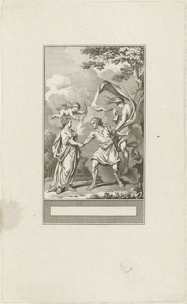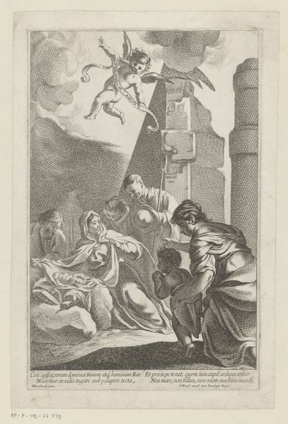 Editor: Here we have Simon Fokke’s engraving "Astronomia", dating roughly from 1745 to 1765. The detail achieved in this print is astounding, although it also feels somewhat staged. How do you interpret this work? Curator: Look at the symbolism employed here; notice how Fokke weaves a complex narrative through potent images. We have what appears to be a female allegory of astronomy reaching towards the heavens, contrasted with the earthly pursuits of the figure by the fire. Do you see how she’s situated between shadow and light? Editor: Yes, there’s a stark contrast, almost like two worlds colliding within the frame. Curator: Exactly. The celestial realm is presented as enlightened, with the angel bearing the torch of knowledge. But note the darker, somewhat demonic, winged figure behind. There’s a tension here. It appears she may be dismissing it by facing forward. What objects surround Astronomia, and what does that communicate to you? Editor: I notice a globe and other scientific instruments, all very orderly and suggesting rational understanding. But I am not sure how to integrate all the symbology? Curator: Indeed. The objects near her, and the demon turning away imply a triumph of scientific thought over the archaic dark. Yet, the engraving also hints at the unseen forces at play. The print speaks volumes about the period's shifting worldview, where scientific inquiry began challenging traditional beliefs, yet it couldn’t entirely shed itself from old thought. Editor: So, it’s a commentary on the struggle between old and new ways of thinking, depicted through potent allegorical figures. Thank you. Curator: Precisely! And by decoding the symbols, we unlock a window into the cultural anxieties and aspirations of the time.