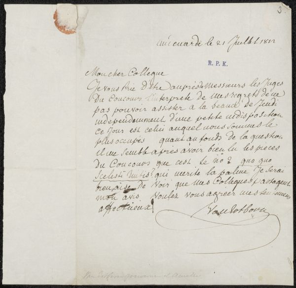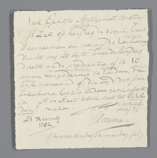 Curator: This understated work on paper, dated 1795, comes to us from an anonymous hand, and is titled "Hilsen fra Nissen." The materials listed are pen, drawing and watercolor. Editor: My initial impression is of a fleeting thought, a whisper caught on paper. There's a certain melancholy in its spareness; it’s the artistic equivalent of finding an old letter. Curator: Indeed. If we examine the composition, we can observe that calligraphy serves as the primary structural element. Note how the script occupies the upper left, balanced by a signature on the lower right, with a delicately rendered miniature drawing, a small island marked with a cross. This establishes a semantic tension, an intersection between word and image. Editor: The text itself, “Souvenir de votre ami, Nissen...” gives me goosebumps. Imagine receiving this memento! The delicate cross on that lonely isle; it's incredibly suggestive. One can feel the implied narrative like the rustle of distant longing and reflection, despite it's simple forms. Is it Romanticism’s embrace of sensibility taken to its near minimalist extreme? Curator: Arguably so. It evokes the Romantic sensibility through its intimate scale, subjective tone, and fascination with feeling. And its anonymous provenance gives it a universal, almost archetypal quality; its power derived precisely from its anonymity and reticence, and speaks about what exceeds all expression. Editor: It's like a dream barely remembered – faded ink on paper, an artifact whispering stories we can almost grasp. And yet, like all effective artworks, it makes you ponder its significance well after the encounter, like a fleeting echo resonating with emotions too elusive to contain. Curator: Yes, it offers a potent demonstration of how even in absence and elusion meaning and feeling may take flight. A poignant message indeed.