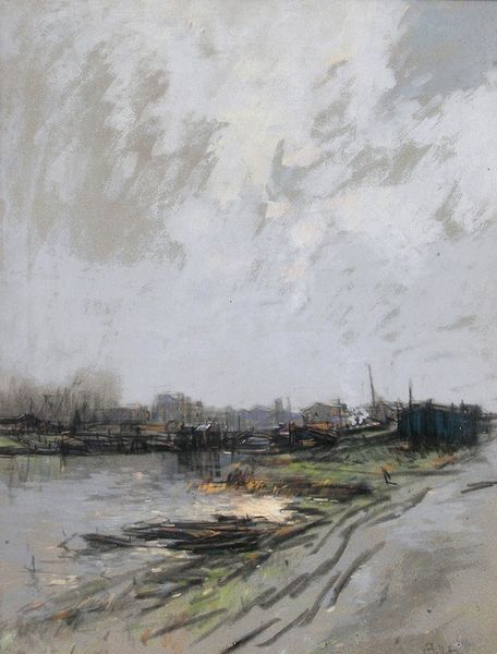 Curator: Before us hangs "North", painted by Konstantin Alexeevich Korovin in 1890. The medium is oil on canvas. Editor: It feels so heavy, doesn’t it? All those layers of gray and the way the boats seem almost swallowed by the fog...it’s beautiful, melancholic even. Curator: The limited palette indeed emphasizes the harsh working conditions of northern harbors at the end of the 19th century. What strikes me is how Korovin, firmly embedded in the Russian avant-garde movement, is already subtly challenging traditional landscape painting here. Look at the thickness of the impasto and how that directly informs the mood of cold desolation. Editor: He definitely conveys the feeling of being utterly alone in a vast expanse of grayness. Almost like the boats are holding their breath. You can almost feel the dampness clinging to everything. Did Korovin spend much time in northern ports? Curator: Indeed. He traveled extensively, and his encounter with the realities of labor and life in these ports clearly influenced his artistic direction, which you see here in the treatment of materiality. We see the subject's relationship to industry; in painting boats in this setting, he's acknowledging the means by which society at large benefited, even while some had to toil in harsh conditions. Editor: I hadn’t thought about that aspect, but it does make me wonder what it would have been like to live there. What was Korovin really seeing in that North harbor? Curator: Perhaps this work also shows his broader effort to capture and give material form to transient moments. Notice the texture and brushstrokes and how this contributes to that idea. Editor: True, and seeing the weight and struggle that might inspire it does also bring the beauty and skill in presenting those details to the fore. Curator: Ultimately, this work showcases that the role of artistic expression isn't limited to aesthetic appeal. Instead, Korovin makes that expression useful as well. Editor: I guess you’re right. Seeing it this way makes me appreciate the weight, the almost grim beauty of the piece, even more. Thanks for your insight.