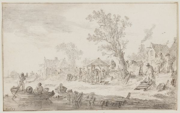 Editor: This is “River Landscape with Ferry,” an engraving possibly from between 1640 and 1800, attributed to Jan van de Cappelle. The detail is amazing! It feels like a slice of everyday life. What strikes you most about this piece? Curator: For me, it’s about understanding this “everyday life” in the context of its time. The Dutch Golden Age was built on trade and expansion, and the landscape here, usually considered as idyllic, hides the consequences of a colonial and commercial system. Editor: So, you’re saying that this seemingly peaceful scene might be presenting an incomplete or even misleading picture? Curator: Precisely. Who benefited from the economic activity represented by this ferry? Whose labor sustained this society? Where is that reflected? The landscape becomes a screen, obscuring the less palatable realities of resource extraction and social stratification. Even the romanticization of nature served a purpose in justifying territorial expansion. Do you see other elements that might lead us to consider social class and economic background? Editor: I notice the figures waiting on the shore. Are they merely observing, or are they waiting for something or someone? Their presence suddenly feels more charged, like they are the disenfranchised who didn't get onto that ferry. Curator: Exactly! The ferry symbolizes movement and connection, but it also highlights divisions—who is included, and who is left behind? Reflecting on these absences encourages us to question whose stories are valorized, and whose are omitted. Editor: I see the engraving very differently now, understanding it as an art piece tied to commerce and colonization of that time. Thank you for sharing! Curator: Thank you. It is in those types of interrogations that this image gains significance today.