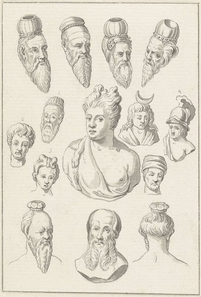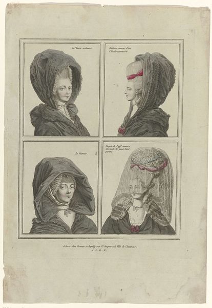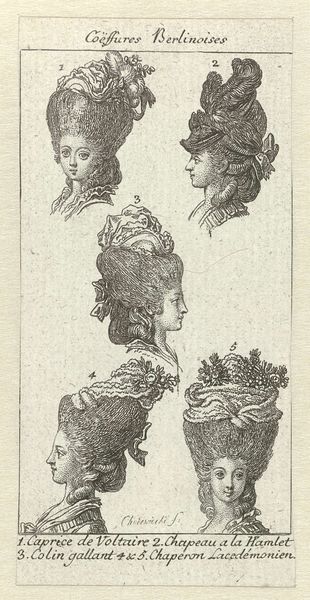 Curator: This engraving by Daniel Nikolaus Chodowiecki is titled "Lauenburger genealogischen kalender auf das Jahr 1783: Vijf dameskapsels met muts of sluier," created in 1783. The print, currently held in the Rijksmuseum, showcases five distinct hairstyles. Editor: My initial reaction is one of fascination with the intricate detail. Each coiffure has a different texture and weight; there is definitely something theatrical about it. It makes me think of displays of status, not just fashion. Curator: Exactly. Note how Chodowiecki employs tight, parallel lines to generate a sense of volume and ornamentation. The varying densities achieve striking visual distinctions between hair, fabric, and skin. Consider the veiled figure in the middle. The obscuring fabric focuses on suggestion rather than complete exposure, contributing an element of concealment and enticement. Editor: I see it also as a commentary on the societal constraints placed on women. How their identities and worth were tied so closely to appearances, and even within that, how carefully they had to negotiate visibility and access. Number three, the woman completely veiled "au Cache malice," hints at ways women had to develop in order to navigate those constraits of aristocratic society, both masking and weaponizing female virtue in plain sight. Curator: Yes, the almost architectural dimension of the hairstyles is quite arresting, isn’t it? Almost like sculptures atop their heads. The elaborate nature speaks to a time when ornamentation and visible artistry played significant roles. Consider the use of line variation in the hair to convey light reflecting from it! Editor: Indeed. I also interpret this almost scientific recording of styles as hinting towards a growing interest in individualism as people sought avenues to establish unique identities within, or even sometimes despite, strict societal constraints. Curator: It’s truly a remarkable encapsulation of 18th-century aesthetics, particularly within Rococo. The detail achieved is amazing. Editor: The details draw one's eyes and encourage thoughtful contemplation. Hopefully listeners today recognize this piece for what it represents: complex narratives about identity, constraint, and beauty that go far beyond hairstyle.