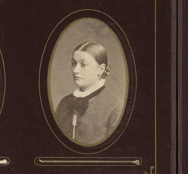 Curator: A fascinating portrait. "Portret van een vrouw met een opgestoken vlecht," or "Portrait of a Woman with an Updo" by Albert Greiner, sometime between 1874 and 1887, captured as a gelatin silver print. The Rijksmuseum holds it now. Editor: It’s remarkably stark, isn’t it? Almost severe. The subdued tones of the print certainly amplify that impression. What’s your read on the gelatin silver process influencing our perception here? Curator: Hugely impactful. The mechanization of photography by this era democratized portraiture, yes, but the silver gelatin process created incredible tonal range and detail that we can analyze now. Look at the way the light reflects off her jacket, defining the very specific textile, likely manufactured in a mill… Editor: Speaking of manufacturing, the rise of the middle class and this era’s particular social constraints surrounding gender—were those playing out here, you think? The lack of ostentation is rather pointed, it seems. Curator: Exactly! This feels like a very conscious statement, placing value on a kind of quiet dignity, certainly for the sitter, but think too about Greiner and his studio; who was he courting as clients? The rising merchant class? Or attempting to present his studio a specific way? Editor: It definitely shifts my thinking. The photograph is not simply a straightforward recording. Instead it feels more like constructing and reinforcing a social value in this very moment through image-making and circulating specific ideologies of womanhood and labor. Curator: And it speaks volumes about who was able to *participate* in this visual culture! Photography may have been democratizing representation, but portraiture like this was far from universally accessible, materially and socially. Editor: It's a sobering reminder of the gatekeeping around representation that even supposedly revolutionary mediums couldn't completely erase. I hadn’t considered the labor or textiles much before but analyzing it in this way creates so many access points to understanding it in its social era. Curator: Absolutely. It changes how one considers the artwork, especially through an ethical, class-conscious lens.