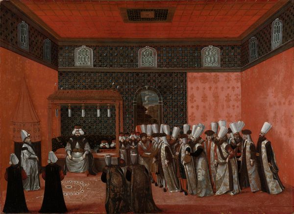 Curator: John Bell painted "Cardinal Bourchier Urges the Widow of Edward IV to Let her Son out of Sanctuary." It's a large-scale history painting currently residing at the Tate. Editor: The somber palette immediately strikes me. The heavy blacks and reds convey a sense of foreboding, as if we're witnessing a pivotal, and potentially tragic, moment. Curator: Indeed. Bell is depicting a key moment in English history, laden with political maneuvering and the vulnerability of women and children in positions of power. The widow, Elizabeth Woodville, is being pressured to relinquish her son. Editor: We can almost feel the weight of societal expectations placed on her. How her agency, her very motherhood, is being negotiated in this fraught exchange. What did surrendering her child mean for her? Curator: Everything. It represented the loss of power, and ultimately, the loss of her sons. The event set in motion the rise of Richard III. Editor: A potent reminder that art can illuminate not just what happened, but the systemic oppressions that enabled such events. Curator: Absolutely, by examining the painting's historical context and the power dynamics at play, we understand more about that period. Editor: An excellent reflection on the intersection of art, politics, and the vulnerability of women and children in moments of crisis.
