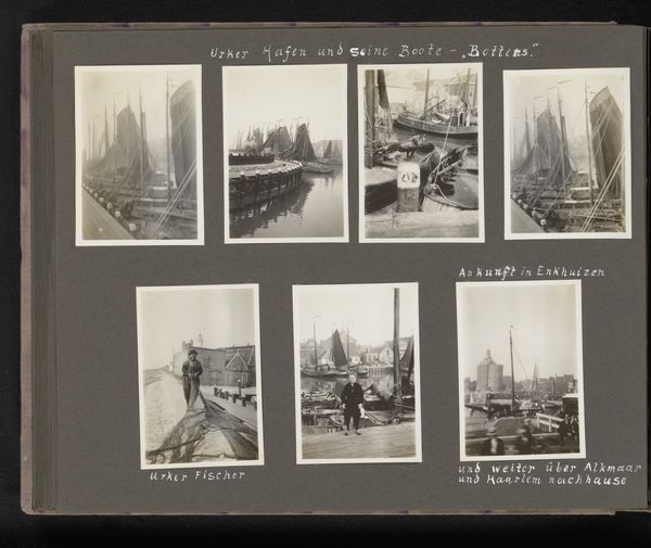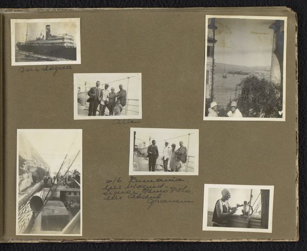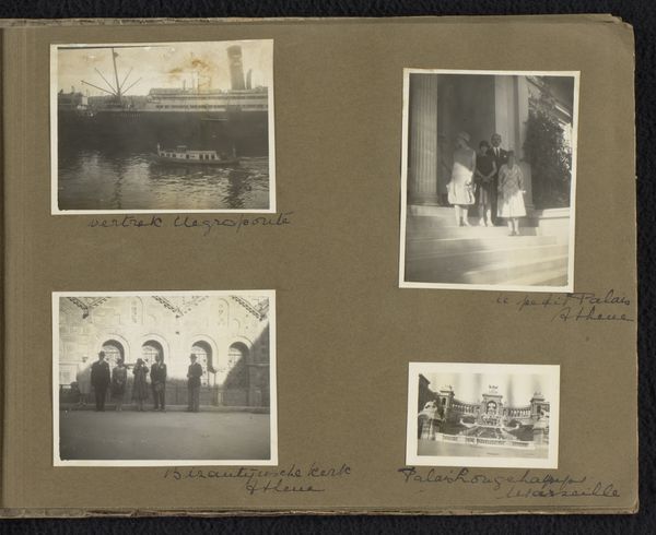 Editor: We're looking at "Vijf foto's van een reis naar Marseille en Griekenland" – that's "Five photos from a trip to Marseille and Greece" – taken between 1926 and 1929 by Carolina (Loentje) Frederika Onnen. It's a collection of gelatin silver and albumen prints arranged on a page, capturing landscapes and cityscapes. They feel very personal, like snippets from a travel journal. What strikes you most about this arrangement? Curator: What sings to me is the silent conversation between Onnen and her world. It’s almost like flipping through a beloved family album, isn't it? There’s a gentle curiosity in her gaze. Imagine her on this trip, a Dutch woman absorbing the light of Marseille and the ancient stones of Greece. Do you notice how the placement almost reads like a story? Editor: I see what you mean! It’s not just a random placement. It begins in the bustling port, then transitions to quieter moments on the deck, and finally… touches these timeless monuments in Greece. It feels so intimate. Curator: Exactly! Intimate and insightful. It's a quiet declaration, almost daring to whisper a shared experience. She sees the grandeur of a modern city, juxtaposed with the eternal presence of antiquity, but she feels neither like an alien. Does that resonance come across to you as well? Editor: It really does, now that you mention it. Before, I was focused on the different locales, but together, it is indeed like a silent journey of discovery and emotion. I thought the pictures themselves were fascinating as records, but now I can appreciate the meaning of collecting and displaying these prints, so you get this dialogue between the different spaces, countries and cultures! Curator: Ah, but isn’t that what makes it magic? What seemed straightforward shows to have hidden whispers to reveal, stories just on the verge of telling. Thank you for opening that album with me, so the trip to Marseille and Greece wasn’t quite so solitary. Editor: Thank you for your wonderful perspectives. Now I look forward to my travels, and hope I too can build this kind of connection with space, and tell my stories.
