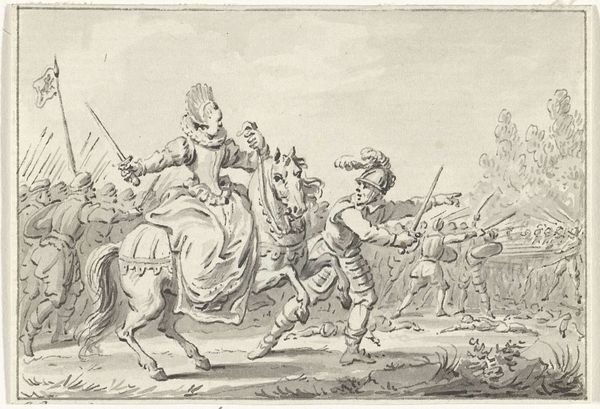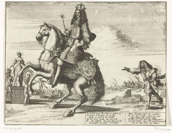 Curator: This etching, titled "Procession, with three men leading three horses," dates back to the 16th century and resides here at the Metropolitan Museum of Art. Note the dynamism captured in this static medium, an early printmaking technique. Editor: My initial reaction is that it feels rather constrained and ritualized. The figures are spaced evenly, the landscape barely exists—all focus on the... performance, I suppose, of man and beast. What historical narratives is it trying to evoke? Curator: Intriguing. The artist, though currently anonymous, used fine lines and hatching to define form and create subtle gradations of light, look closely. It results in a balanced composition where each group of man and horse mirror the others. It is Academic, and emphasizes structure. Editor: Absolutely. However, in this rigid format, it might be fair to examine how social hierarchy plays out through equestrian display. Horses were costly status symbols, these men seem trained. Who held access? What’s happening outside the lines—outside of this tightly controlled display? Curator: Such questions pull back the curtain, yet the image also serves as an artifact—documenting 16th-century fashion and the artistry of the engraver. Note the detailing on the bridles and saddles; each figure possesses individually rendered attire. Editor: Yes, and within that attention to detail, one must recognize potential power dynamics and inequalities reflected, intentional or not. To consider it a neutral representation, separate from societal structures, feels dismissive. Curator: I see your point. This print functions as both a window into a particular historical aesthetic and a mirror reflecting our own contemporary lenses and critiques. Editor: Precisely. Through an activist lens, art provides evidence to past and future generations, and the opportunity for discourse and progress.