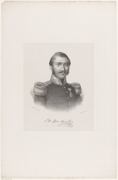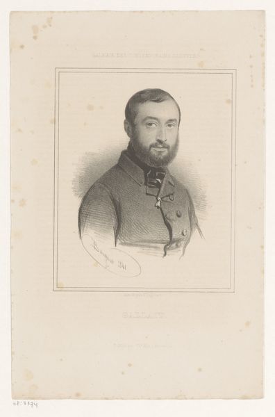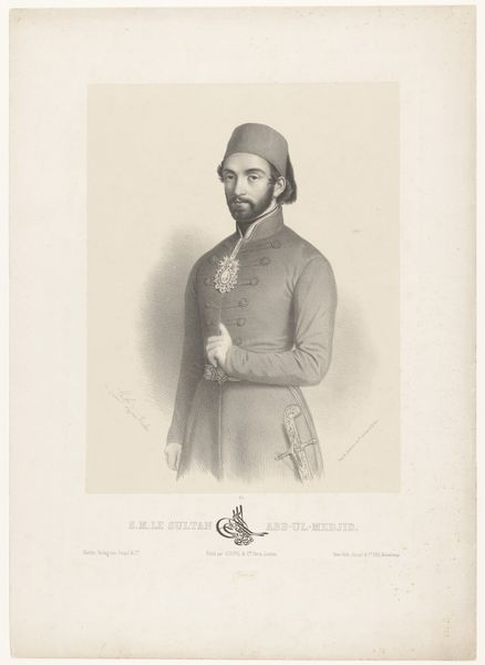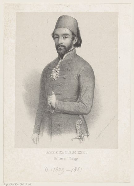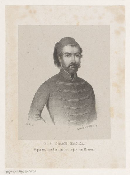 Curator: Here we have Marie-Alexandre Alophe's 1853 portrait of Omar Pasha Latas, Ottoman General, rendered with pencil and engraving. Editor: He exudes such stillness, almost a sense of melancholy despite the rigid military bearing. The delicate pencil strokes give it an ephemeral quality, like a memory fading. Curator: It's interesting that you pick up on melancholy. This image exists within a charged historical context of orientalism. Representations of Ottoman figures were often used to reinforce Western perceptions of the "exotic" or "other". How might this influence the General's depiction? Editor: I can see the symbolic framing – the Ottoman figure presented for a European audience. The meticulously rendered details of his uniform, especially the buttons and ornate belt, almost become signifiers of power, meant to be both impressive and slightly foreign. It’s playing into existing visual tropes. Curator: Precisely. And Latas himself had a fascinating life. He was born in Austrian territory and converted to Islam before rising through the Ottoman ranks. Considering this, the portrait might also be interpreted as an assertion of a new identity, a rejection of his European past. What about the Ottoman symbols at the bottom of the engraving? Editor: Those Ottoman characters speak to layered identities, but remain opaque to Western eyes, heightening the mystique. The symbols point towards cultural endurance even as orientalist interpretation obscures complex realities. Curator: It reminds us that even a seemingly straightforward portrait can be a site of cultural negotiation. This wasn’t just about recording a likeness, but about situating a powerful figure within a very specific political and ideological framework. Editor: Looking closely at the lines, there’s an interesting convergence. The sitter appears vulnerable, despite the air of authority. It humanizes Omar Pasha Latas, yet, at the same time, that softness is presented in a space meant to showcase foreign allure, perhaps for a particular sensibility of beauty and style. Curator: This image allows us to ask what is really meant by power and its relationship with the politics of representation in the 19th century. Editor: Indeed. The layers of meaning beneath a subdued surface reveal how representation perpetuates power and even mystery.